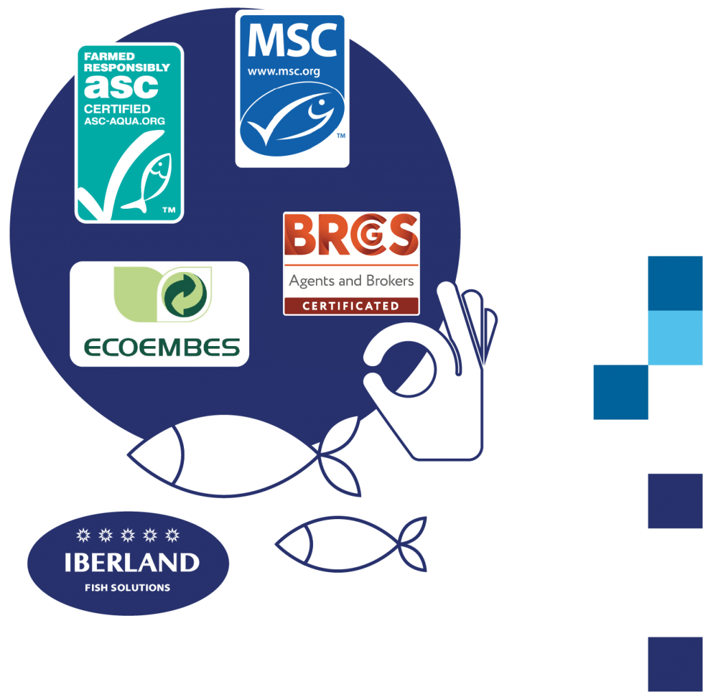 Ponemos en valor nuestras cadenas de obtención y distribución de derivados del pescado. Lo hacemos con certificaciones internacionales como la MSC, la ASC, la BRC, y con la propia de Grupo Iberland, el sello verde Seafood for life que identifica los productos que cumplen con los requisitos básicos de calidad y aprovechamiento responsable de los recursos derivados de la pesca.